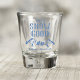 Funny ski bachelorette shot glass featuring a drawing of winter mountains, trees, a skier, the humorous saying "up to snow good", and a text template that is easy to personalize.