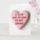This funny greeting card shows a single pastel pink heart centered on a plain white background. The heart looks like a glossy candy or a small ceramic keepsake, with soft curves and a shiny surface that catches the light. Across the front of the heart, the message reads “I ALSO LIKE YOU WHEN I’M NOT DRUNK.” The text is in all-caps block letters, printed in deep red and placed right across the middle so it’s impossible to miss. The heart’s gentle color and smooth finish add a sweet touch, while the message adds a funny, honest twist about real feelings. With no extra objects or scenery, the simple setting keeps all the attention on the heart and its statement. It’s a great pick for someone who appreciates romance with a bit of humor ❤️💌🍫.