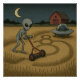 A gray space alien with his flying saucer UFO and a push mover is making crop circles. Funny science fiction humor "generative content" artwork.
