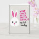 This card features a simple long-eared spring animal in white on the left, set against a lightly textured pale gray background with a dark border. Its big black eyes with tiny lashes and a small pink nose give it a sweet, almost flirty curiosity, as if it’s sharing an inside joke with someone just off to the right 🐰. The tall ears rise up with bright pink inner sections, adding a pop of color that feels like a blush. On the right side, the question “WHAT COMES AFTER EASTER SUNDAY?” appears near the top in uppercase magenta lettering. Beneath it, the answer “egg fart monday” sits lower in looser black cursive-style writing, creating a funny contrast between the neat question and the cheeky reply. The layout leaves plenty of open space, so the character and the words feel like they’re in a light back-and-forth, like friends teasing each other 🌷. A faint diagonal grain runs across the gray background behind the white face and the pink-and-black text.