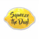 Funny quote sticker featuring a 3D lemon framing the quote "Squeeze the Day" in bold calligraphy script.