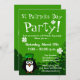 St Patricks Day party invitations | Customizable. Green St Pattys Day design with lucky shamrocks. Vintage 4 leaf clover decorations for your Irish Saint Paddys Day celebration. Leprechaun penguin cartoon waving irish flag.