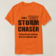 a graphic tornado with the text "I am a storm chaser. If you see me running, try to keep up'" on a mens orange t-shirt. The color and style of the t-shirt is optional.