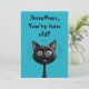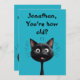 A birthday card with an illustration of a very surprised black cat on a blue background. Fully editable text on the front and back. Create your personal birthday card.