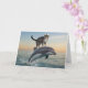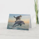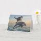 A cute funny cat greeting card featuring a grey tabby wearing a captain's hat riding a dolphin.