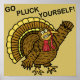 This humorous Thanksgiving turkey design shows an angry cartoon turkey bird waving a winged fist with a toothy sneer, saying "Go Pluck Yourself!" It's a funny Thanksgiving poster to display on Turkey Day.