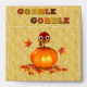 Funny Thanksgiving illustration: a turkey sitting in a pumpkin and looking out of it.