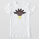 This t shirt features a funny cartoon of a turkey with big black eyes, a small yellow beak and tail feathers sticking up. The feet are facing in opposite directions making the turkey look clumsy. This amusing design is ideal for Thanksgiving.The design is shown on a kids white tee but is also available on other styles and colors of clothing for kids, babies, women and men.