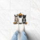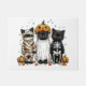 A charming illustration featuring three adorable black cats dressed in classic Halloween costumes. From left to right, a cute cat is wrapped as a mummy, a whimsical cat wears a sheet to be a ghost with a carved pumpkin on its head, and a spooky-fun cat is in a skeleton outfit. The scene is completed with festive pumpkins and scattered autumn leaves, making it perfect for fall and Halloween-themed projects.