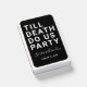 Set the tone for your wedding reception, engagement party, or wedding anniversary with this funny matchbox favor. This design features simple bold text "TILL DEATH DO US PARTY". The text template allows you to personalize this design with the bride and groom's names and wedding date. You can also change the text to other wording if you desire. Available in a variety of colors - shown here in white text with a trendy black background.