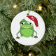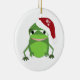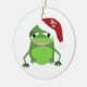 A hilarious wide mouth toad in shades of green. He's wearing a red and white santa hat.