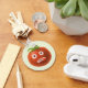 Funny tomato keychain with a cartoon illustration of a weird tomato character with stuck out tongue and a puzzled look in its eyes.