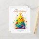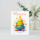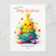 "Have a Very Jolly Christmas" says a smiling face cartoon retro Christmas tree. The cheerful colors range from yellow to green to teal and blue with a yellow star on top and tumbling ornament balls. This is a nice fun and funny postcard for your friends or relatives or the kids in your life. All the text, which is in teal and orange-red, is editable. Be sure to change the family name and year to your choices.