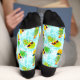 Funny, tropical Christmas pineapples wearing sunglasses and festively decorated with Christmas lights, ornaments and candy canes. This pattern has a pastel blue background with Hawaiian hibiscus flowers. Shown here on custom, premium and sustainable socks. Fun design for celebrating a beach Christmas!