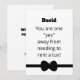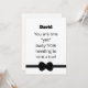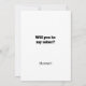 This funny usher card features the words, "You are one "yes" away from needing to rent a tux" on the front. You can customize the name of your potential usher above the words. Below the words you will find a bowtie. On the back side of the card, are the words, "Will you be my usher?" You can even customize your name. Copyright Kathy Henis