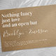 Plain white envelopes are included with paper invitations and will come to fit the invitation size you select. If you don’t need the envelopes, you may choose to not receive them by selecting the dropdown below "Envelopes" and choosing "None." If you’d like to have a design on your envelopes, you can browse all of these available envelopes to find the design that complements your Funny Typography Open Bar Kraft Wedding Invitation.