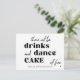 Simple black and white trendy bold typography wedding save the date postcard with a funny "there will be drinks, dance, and cake" modern quote script.