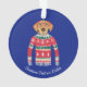 Funny winter holiday Christmas ornament featuring a dog wearing red glasses and an "Ugly" Christmas Nordic Sweater. Actually, we think he's rather cute! Add your custom text below or delete. Makes a perfect Christmas or Winter Birthday Gift for dog lovers. Also great for White Elephant holiday or Secret Santa gift exchange parties.