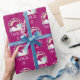 Wrapping paper with a humorous design. A sleeping uncorn with a fancy mane and tail. Deocrated with a trio of stars. A rainbow arched overhead. A circular wreath made up of clouds, hearts and flowers for additional girly flair. Typography says Magical AF. Humorous and cute. The background is a dark pink cerise color.