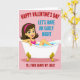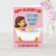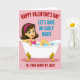 This digital illustration shows a cute Valentine's Day scene. In the middle, there's a smiling cartoon lady in a white bathtub with fancy golden feet. Her hair is dark, and she wears a pink headband and top that matches the soft pink background. She has shiny eyes, a pink blush, and a friendly smile while lounging in the blue water with one arm on the tub. The image has bold text that sets a fun, flirty tone. At the top, it says "HAPPY VALENTINE'S DAY" in red and "LET'S HAVE AN EARLY NIGHT" in blue underneath. Below the tub, it says, "I'LL EVEN SHAVE MY LEGS!" adding a playful touch. The color scheme is simple but effective in conveying a cheeky message of romance. The design is clean and straightforward, focusing on creating a connection with the viewer. This card is great for sharing Valentine's Day love and laughter ❤️💌🍫.