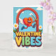 This greeting card shows a cartoon orange heart character running forward with a big smile and bright white teeth. It has small white wings on its sides, blue sneakers on its feet, and it’s holding a golden bow with an arrow ready to send some love. Behind it is a tall, arched frame in deep red, set against a light blue sky with soft white clouds. Two simple white daisies with yellow centers sit near the base of the arch, adding a sweet, friendly touch. At the bottom, the card reads “VALENTINE VIBES” in large, rounded, 3D-style block letters that fade from yellow to green to blue, with a white outline. Puffy cloud shapes sit around the text, making the message feel light and fun. It’s an easy, cheerful design that fits romance or friendship perfectly ❤️💌🍫, and it’s a nice way to pass along Valentine’s Day feelings to someone you care about.