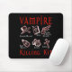 The image is a stylized illustration of a vampire killing kit. The words "VAMPIRE" and "KILLING KIT" are written in large, red, gothic-style font at the top and bottom, respectively. In between, there are six white outlined drawings of items traditionally used to kill vampires: a stake and mallet, a bible, a pistol with silver bullets, a bottle of holy water, garlic, and a cross. Perfect gift for Goths and vampire lovers.