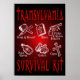 The image is a stylized illustration of a vampire killing kit. The words "Transylvania" and "Survival KIT" are written in large, red, gothic-style font at the top and bottom, respectively. In between, there are six white outlined drawings of items traditionally used to kill vampires: a stake and mallet, a bible, a pistol with silver bullets, a bottle of holy water, garlic, and a cross. Perfect gift for Goths and vampire lovers.