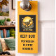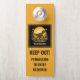 Set against a prehistoric moonlit scene, the bellowing Velociraptor gives a fierce and funny message to your potential visitors: this colorful Velociraptor doorknob hanger features two bold messages: “Keep Out” and “Permission to Enter Required.” Perfect for Dinosaur fans of all ages.