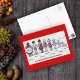 This post card is a funny vintage red and back illustration is a Victorian family all lined up on the beach in their old+fashioned bathing suits with the family dog. The text reads The Whole Dam Family on Vacation with each member's family role listed.