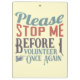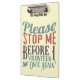 Gather your important sign up sheets and attach them to your very own volunteer clipboard. Great for volunteers of all kinds that want to be reminded: Please stop me before I volunteer once again. Vintage typography style includes one "pointing hand" to point you in the right direction. Funny volunteer thank you gift.