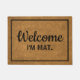 Funny doormat featuring a faux coir texture print, and the humorous saying "welcome I'm mat".