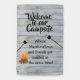 This super cute and funny garden flag says "Welcome to our campsite where marshmallows and friends get toasted at the same time". There's a campfire and two marshmallow sticks and it's all against a weathered wooden background. You can customize it to say "Welcome to our cabin or camper" by clicking on "personalize this".