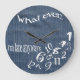 Funny Whatever I'm Late Denim Clock, Burlap look background with numbers all mixed up on the bottom- silly funny clock for those who are always late anyways. Great gag gift for boss.