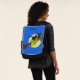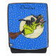 This Bold Face adult backpack with a interchangable front face has a funny witch wearing a green dress and black hat flying past a full moon on her broom with her black cat riding on her back on a blue night sky background covered in yellow stars. Customize your name with the template.