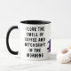 Funny Witch Themed Purple Green & Black Halloween Mug - Customizable text reads "I Love the Smell of Coffee and Witchcraft in the Morning" with a watercolor illustration of a witchy cup of coffee complete with purple witch hat and flying broom. Perfect for those who love all things Halloween, witchy or just want a fun and funny mug for the fall season.
