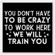 You don't have to be crazy to work here we will train you, funny sarcastic office quote design for women and men. Awesome present idea for new employee, coworker who just started to work with crazy coworkers team. Say welcome to your new coworker in style. Funny outfit for coworker who love sarcastic sayings and quote, it makes a great employee appreciation present for new office colleague, friend, employee, teacher... Grab it for birthday, father's day, employee appreciation day, teacher's day, mother's day