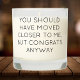 Light up their new space with this hilarious "You Should Have Moved Closer to Me, But Congrats Anyway" scented candle. Perfect as a housewarming or farewell gift, this candle combines humor with warmth, making it a thoughtful yet funny present for loved ones. A delightful touch to any home decor!