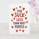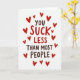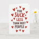 This greeting card puts a funny, affectionate message front and center on a plain white background. The main text reads “YOU SUCK LESS THAN MOST PEOPLE,” with “YOU” and “THAN MOST PEOPLE” in dark brown, simple printed letters. “SUCK LESS” stands out in bright red, thicker printed letters, making it the first part you notice. Small red hearts are scattered all around the words, in different sizes, like a loose frame. The hearts add a sweet touch that balances the teasing line and makes it feel caring 💘. Overall, it comes across like a light joke between close partners or friends who like to show love with a grin