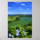 Furnas Lake with hydrangeas on the foreground. This lake is located in Sao Miguel island, Azores, Portugal.