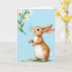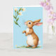 This design shows a light brown bunny standing upright on its hind legs, forepaws held close as it leans in with a tender, curious tilt of the head 🐰. Its wide, dark eyes and small pink nose face the upper left, as if drawn toward a nearby flower the way two friends lean closer to share a quiet moment. A slim green stem rises there with three creamy white, bell-shaped blossoms, softly lit and framed by fresh green leaves 🌷. The bunny’s fur is shaded in caramel and creamy white, with fine whiskers and a fluffy white tail that adds a gentle, cozy touch. The background is a pale, spring-sky blue that keeps the scene airy while letting the warm fur and green stem stand out. A short greeting line sits near the top in a light, spring green, leaving the center open for the illustration. Along the bottom edge, a strip of green grass is dotted with tiny white flowers beneath the bunny’s feet.