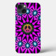 Custom wallet style phone cases made with bright fuchsia pink, starburst patterns centred with a pink and orange peace symbol ♥ webgrrl.art