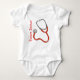 Cute white baby one piece bodysuit, with graphics of a red stethoscope and red text reading Future Doctor. Great baby shower gift idea.