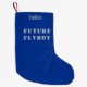 Fun stocking for military kids features "Future Flyboy" in military style stencil text with customizable child's name in modern script. Air Force blue background with gray and white text. Perfect for baby's first Christmas.