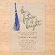 Minimal graduation party invitation featuring hand drawn illustration of a blue tassel with a hand lettered typography text that says "the future is bright."