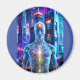 A glowing human form stands against a backdrop of futuristic skyscrapers, with vibrant colors and energy points illuminating various parts of the body. The high-tech cityscape reflects neon lights, creating a dynamic and energetic atmosphere.