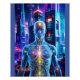 A glowing human form stands against a backdrop of futuristic skyscrapers, with vibrant colors and energy points illuminating various parts of the body. The high-tech cityscape reflects neon lights, creating a dynamic and energetic atmosphere.