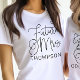 Modern and casual chic black calligraphy script "Future Mrs." women's bridal wedding tee shirt features custom text that can be personalized with the bride's married last name. Perfect for the bride to wear at the bachelorette party and the wedding weekend!