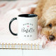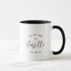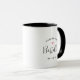 This chic Future Mrs mug features a custom last name in flowing calligraphy script with a wedding date and sweet pink heart accent on a crisp white background with a bold black handle and interior. The contrast of the black interior against the delicate script creates a modern, stylish look. The last name and date are fully editable. A stunning engagement gift, bridal shower keepsake, or bachelorette treat for the future Mrs.