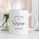 Celebrate the bride to be with this charming Future Mrs mug featuring a custom last name in flowing calligraphy script, a wedding date, and a sweet pink heart accent on a white background with a coordinating pink interior. The elegant, minimalist design is perfect for the engagement season. The last name and date are fully editable. An ideal engagement gift, bridal shower keepsake, or bachelorette treat for the future Mrs.