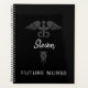 Show your love for your upcoming healthcare profession with this Future Nurse Medical Caduceus Black Personalized Planner. The design has a bold black background and dark grey caduceus symbol on the center. The text is "future nurse" in bold white font lettering. Click personalize template option and enter name. It is in calligraphy script across the middle of front side.
